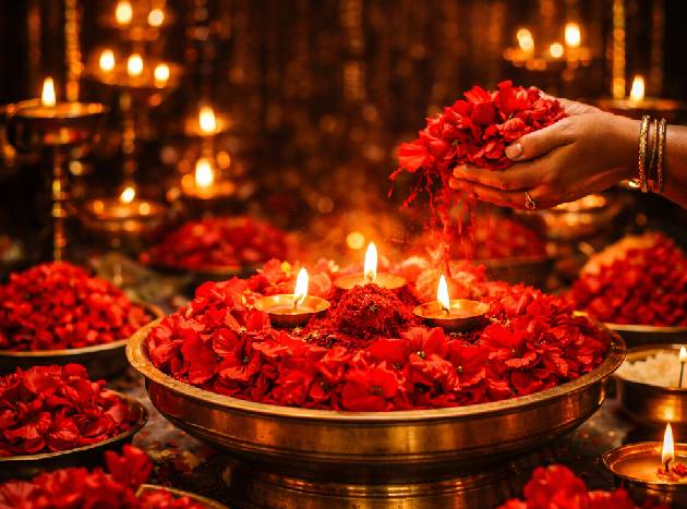 Rakthapushpanjali is a sacred offering in Kerala’s ritual traditions, especially in Bhagavati temples. It involves dedicating fresh red flower petals—symbolizing blood, devotion, and protective energy—to the deity. The ritual is performed to seek blessings for strength, protection, and the removal of obstacles, and is accompanied by chants, prayers, and traditional lamps.