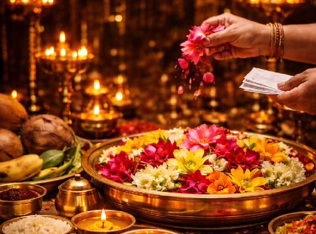 Bhagavathi Pooja is a special ritual performed during temple festival seasons, using offerings such as kumkumam and kalabham to honor the Goddess. In Hindu tradition, a pooja is a sacred act of worship dedicated to one or more deities. The Sanskrit word “pooja” means reverence or adoration. Poojas may be performed at home or in temples, often marking important life events or festivals such as Lakshmi Pooja and Durga Pooja, invoking divine blessings and protection.