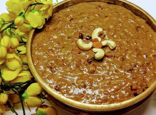 It is a sweet porridge prepared with six nazhi (seer) raw rice, six nazhi ghee, six kilogram of jiggery, dried ginger, cardamom, raisings and six coconut as ingredients.